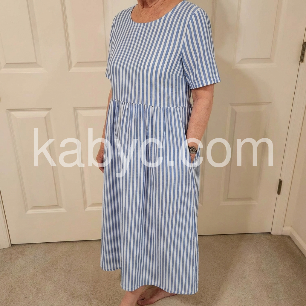 Blue White Stripe Linen Blend Midi Dress with Pockets
