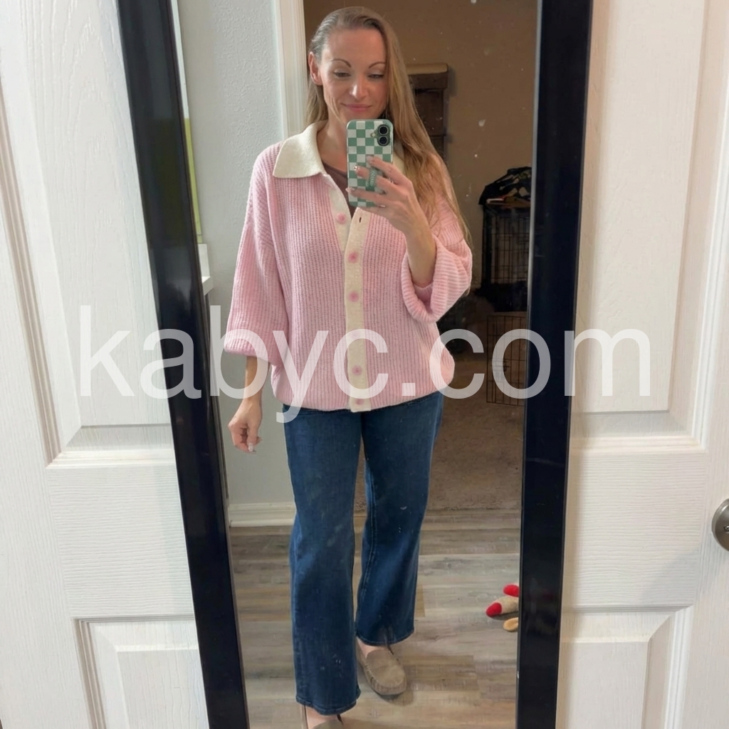 This sweet pink collared long sleeve cardigan is the perfect addition to any wardrobe. Made from high-quality materials, it offers both comfort and style. Its versatile design allows for easy pairing with any outfit, making it a must-have for any fashion enthusiast. Embrace comfort and sophistication with this cozy sweater.
