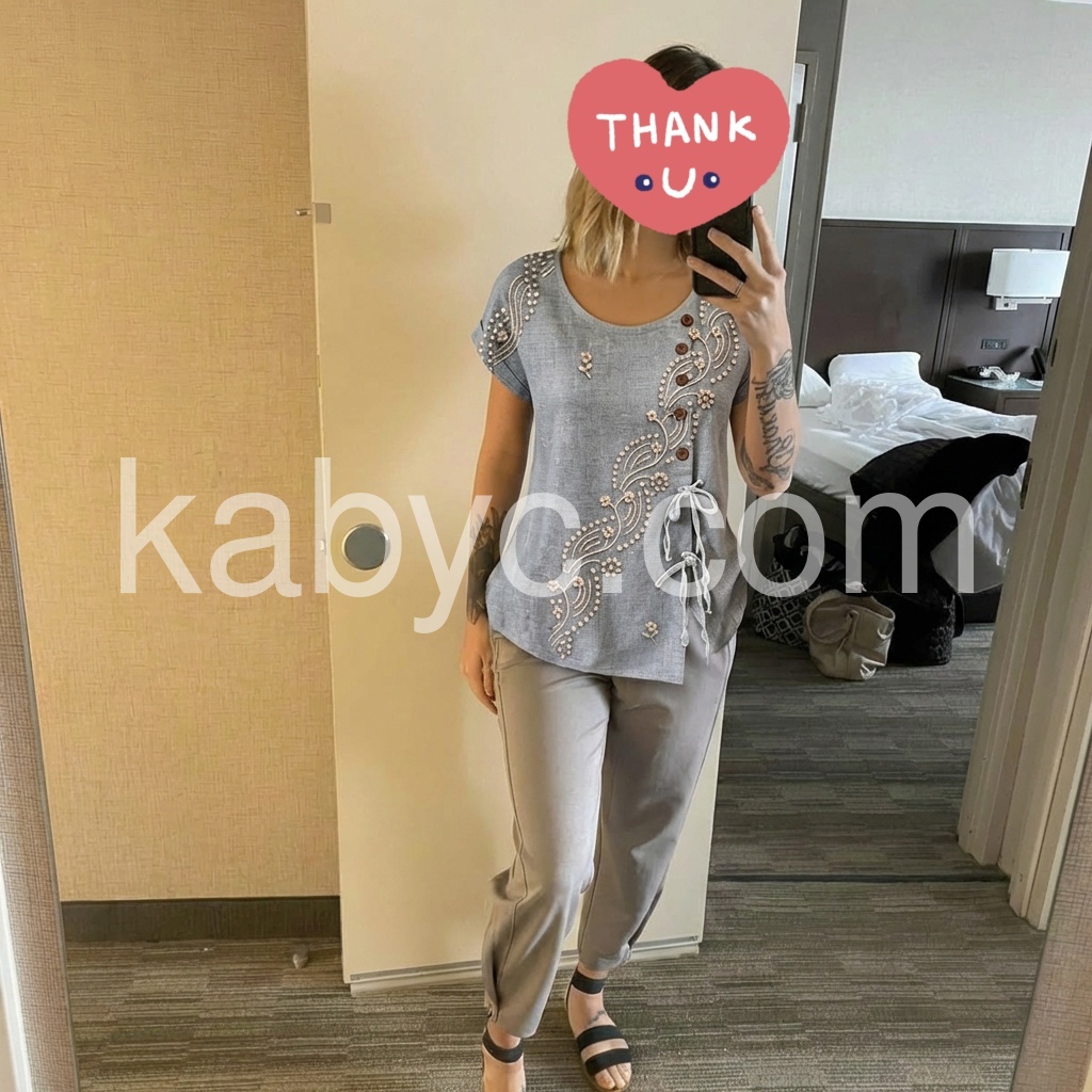 Perfect boho top! The grey color is very versatile. I love the short sleeves and the overall airy feel. I washed it twice already and the embroidery held up perfectly.
