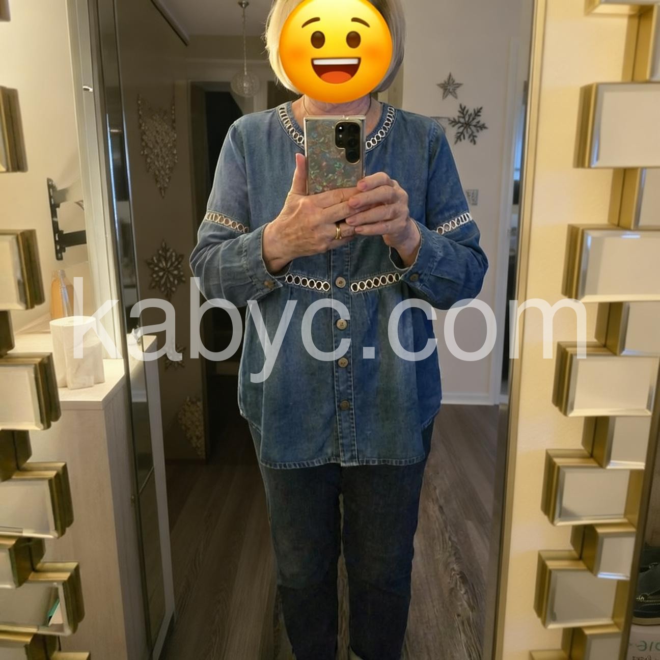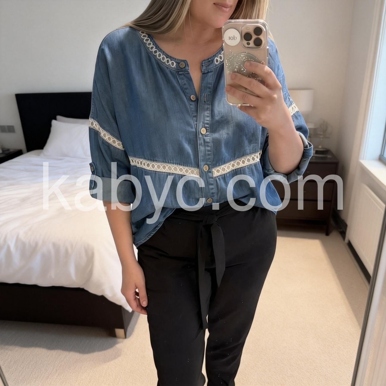 Embrace laid-back elegance in this Blue Denim Button Down Top with Embroidered Trim, a stylish and comfortable piece that blends classic denim appeal with artisanal details. Crafted from soft, medium-wash denim fabric, this tunic features a relaxed, oversized silhouette with a flattering round neckline and front button closure, offering both ease and timeless charm. The standout design element is the decorative embroidered trim—featuring a delicate dotted pattern—accenting the neckline and waistline, adding a touch of boho flair and texture. Styled here with layered necklaces, bracelets, and distressed denim bottoms, it’s ideal for weekend errands, coffee dates, or a leisurely walk through the city.