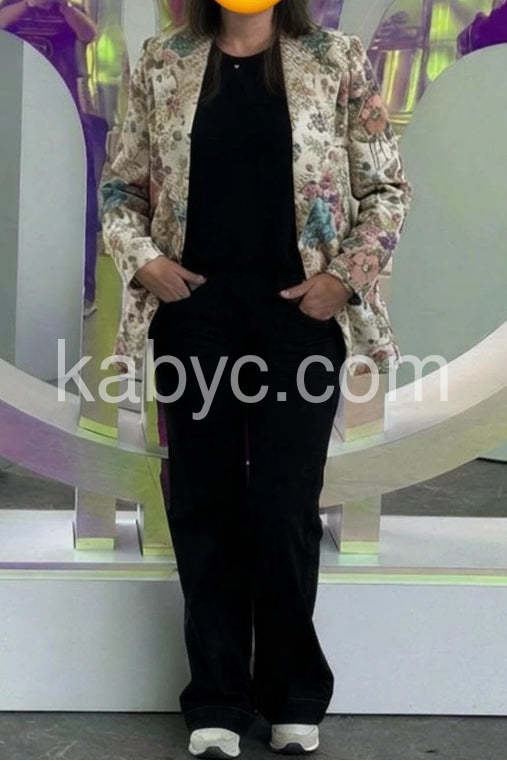 This stunning floral jacquard blazer beautifully blends timeless elegance with modern flair. Crafted from richly textured fabric, it features a delicate tapestry of vintage-inspired blooms in soft hues of blush, lavender, peach, and teal, set against a neutral cream background. The tailored design includes classic notched lapels, long sleeves, and structured shoulders that offer a flattering silhouette—perfect for elevating any outfit. Paired with a simple white tank top and light-wash jeans, it strikes the ideal balance between sophisticated and casual, making it ideal for brunch dates, office-to-evening transitions, or springtime events. The intricate floral pattern adds depth and romance, while the lightweight construction ensures comfort during warmer days. A versatile statement piece that brings artistry and charm to your wardrobe—ideal for those who appreciate refined style with a touch of nature’s beauty.