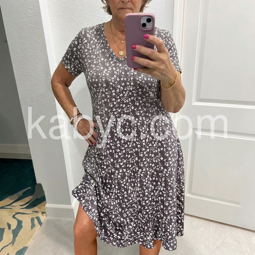 The V-neck and short sleeves keep it light and breezy, while the fitted waist and flowy skirt hug my curves just right. I love how it swishes when I walk!