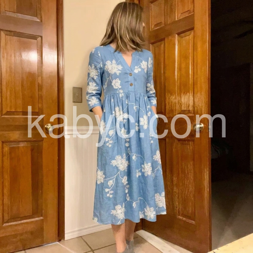 Crafted to solve the "plain linen dress" pain point, this dress is adorned with intricate floral embroidery that adds artistry to everyday wear. The V-neck flatters the bust, while the pleated waist cinches without squeezing.