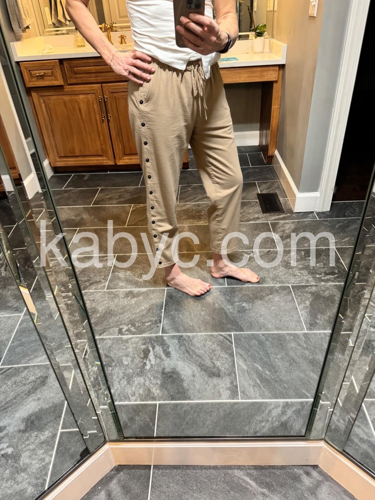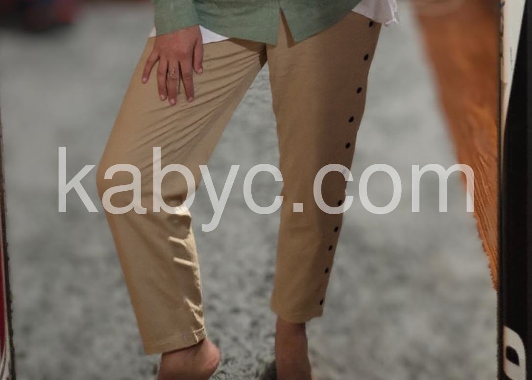 These pants are so comfortable and stylish. The beige color is versatile, and the side buttons add a nice detail. Perfect for both casual days and more dressed-up occasions.