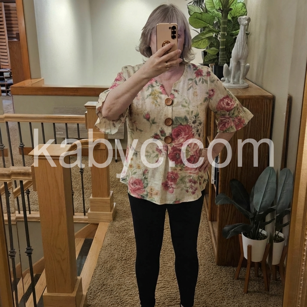 This lightweight blouse features a soft floral print with pink roses on a cream base. V-neckline with wooden buttons down the front. Flared three-quarter sleeves with ruffle details. Perfect for spring or summer outfits. Effortlessly feminine and relaxed.