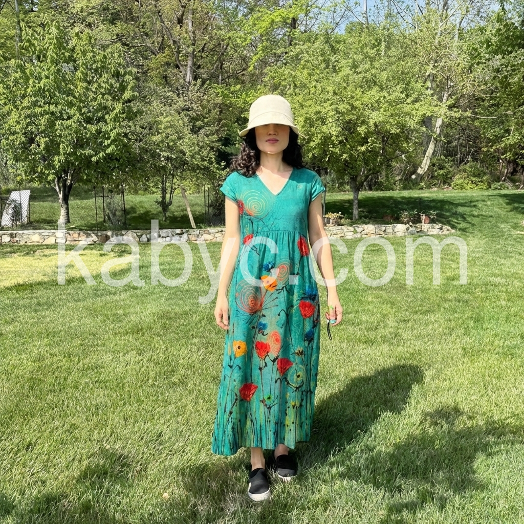 If you like unique, artsy prints, this is the dress for you. The painted flower design is stunning against the green background. It feels very boho chic and the material is soft.