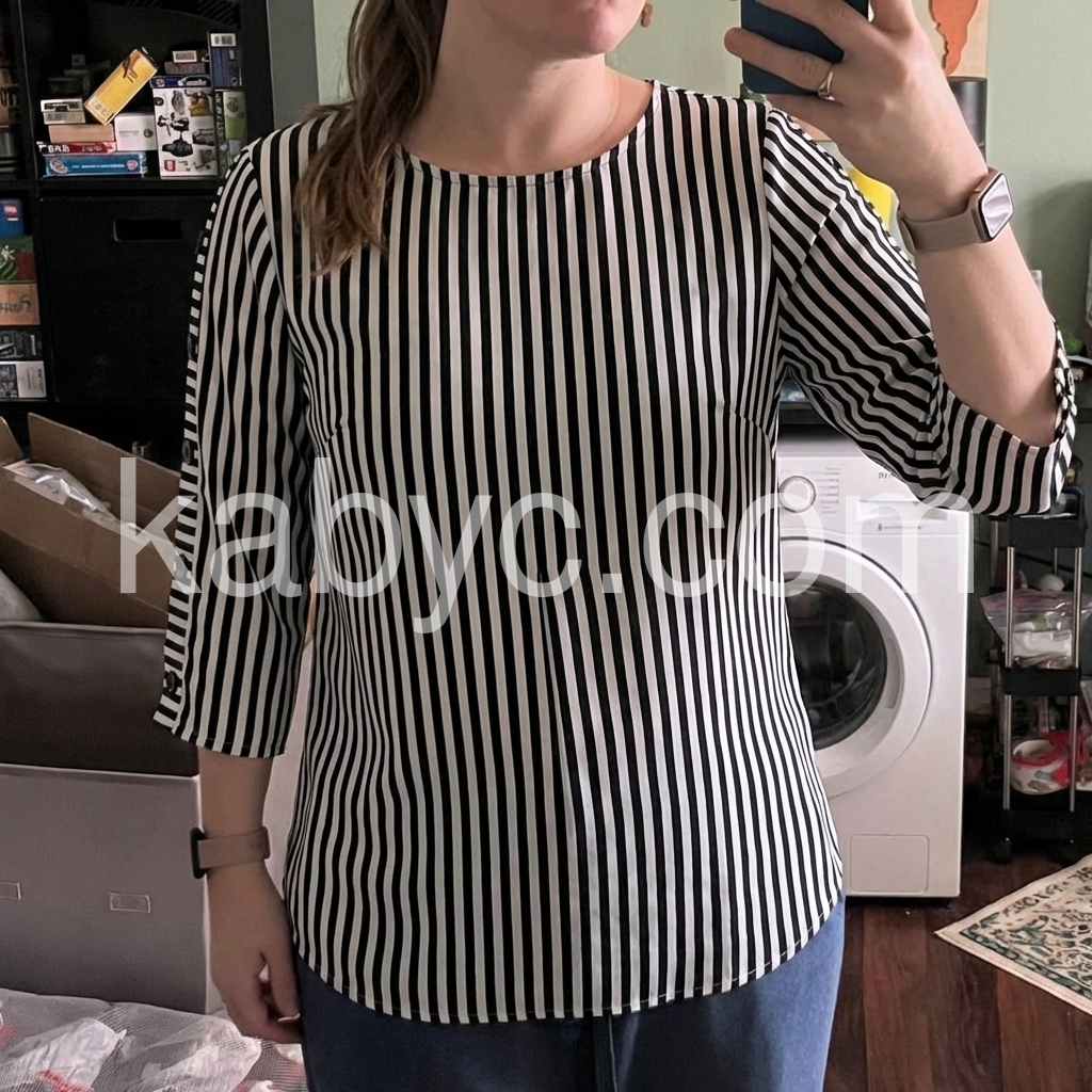 As a curvy woman I always look for tops that flatter my shape without clinging. This blouse is perfect. The vertical stripes elongate my torso and the cut hides my tummy beautifully. Great purchase!