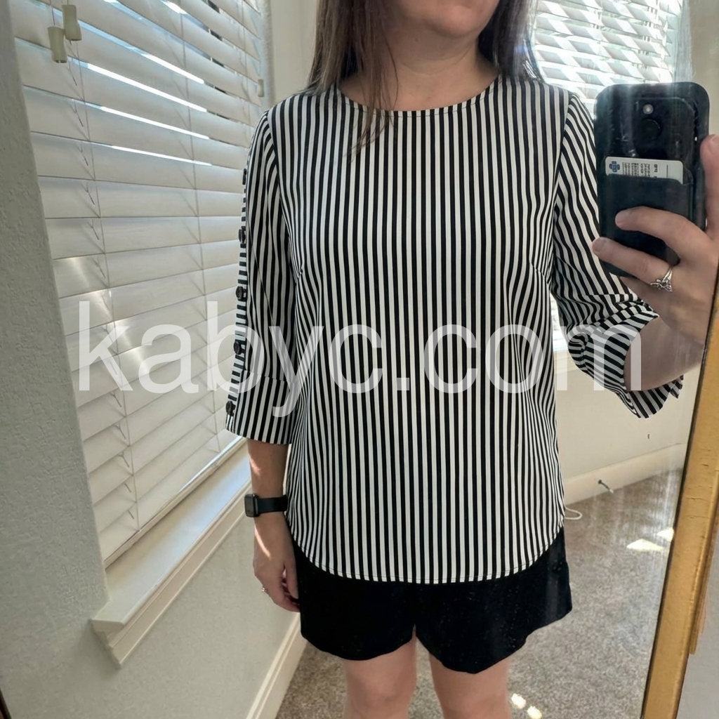 I absolutely love this top! The vertical stripes are incredibly slimming and the fit is just loose enough to be comfortable without looking baggy. The button details on the sleeves add a really cute touch. Perfect for work or a casual day out.
