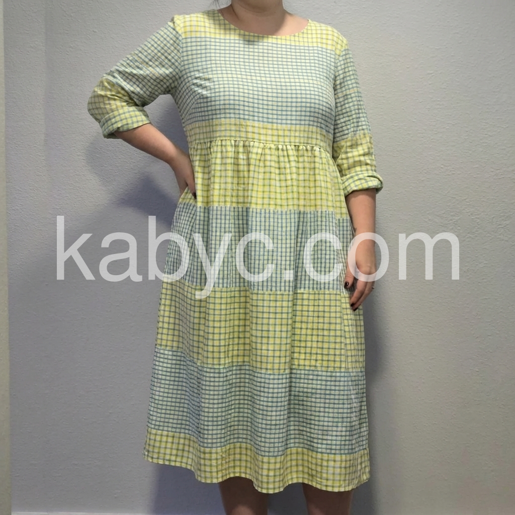 This midi dress celebrates effortless summer style with a playful color-block gingham design. The round neck, 3/4 sleeves, and tiered skirt offer a relaxed, flowy fit.