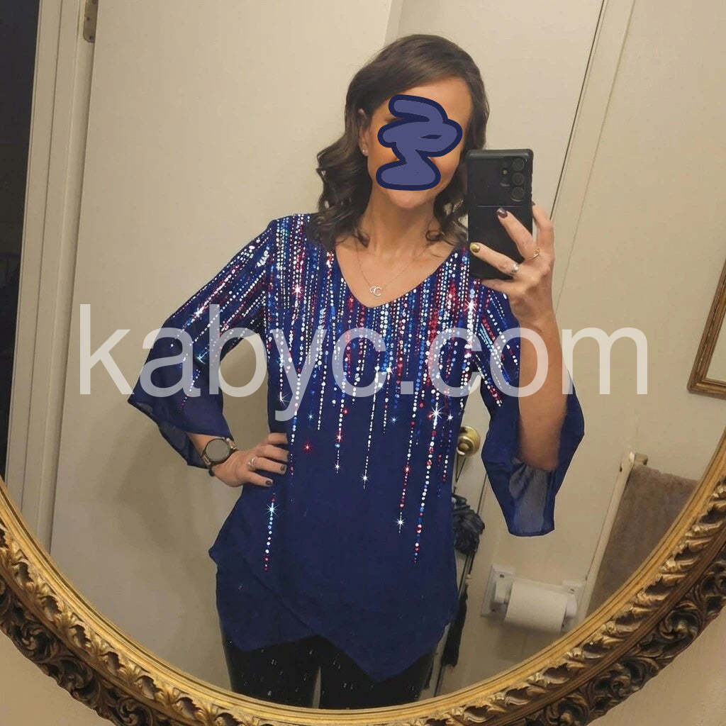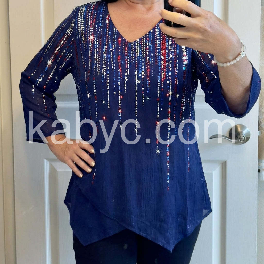Light up your look with this Sparkling Starlight Print Blue Top, a dazzling piece that combines bold patriotism with glamorous flair. Crafted from lightweight, flowing fabric—likely rayon or cotton blend—this tunic features a deep navy blue base adorned with a mesmerizing vertical pattern of red, white, and silver sequins and star-like accents, creating a radiant "falling stars" effect that sparkles in the light. The relaxed, oversized silhouette offers effortless comfort, while the V-neckline adds a touch of femininity and elegance. Three-quarter sleeves with a subtle flare enhance the boho-chic vibe, and side pockets provide both practicality and style. Perfectly styled with white jeans, palazzo pants, or denim shorts, it’s ideal for Fourth of July celebrations, summer parties, or festive outings. Inspired by the vibrant, holiday-ready fashion found on Lulus.com, this top is a show-stopping choice for anyone who loves eye-catching details, patriotic colors, and wearable glamour. Whether you're dancing under fireworks or enjoying a sunset picnic, let this sparkling tunic bring a sense of joy, celebration, and timeless beauty to your wardrobe.