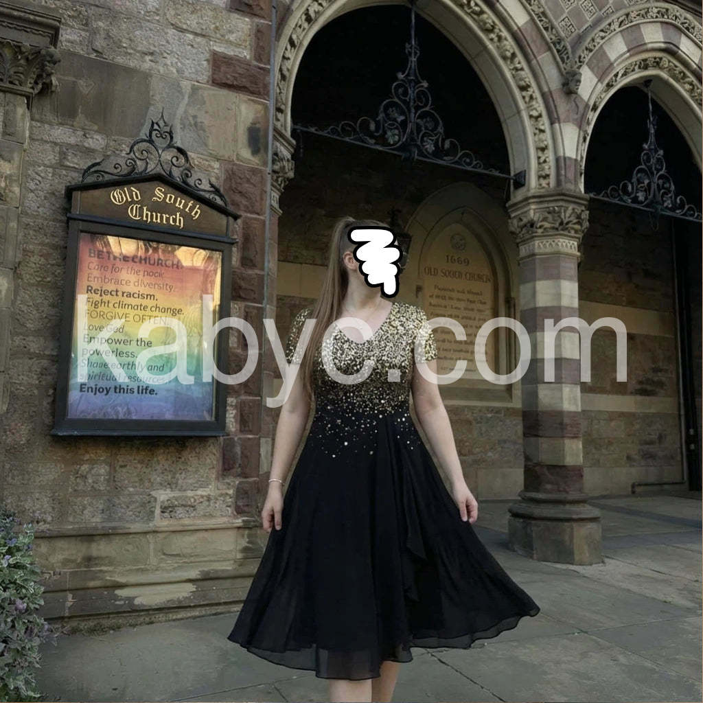 This elegant V-neck midi dress combines sophisticated design with practical comfort. The short sleeves offer versatility for various occasions, while the flattering V-neckline enhances your neckline. The midi length provides a balanced silhouette suitable for both professional settings and social gatherings. Crafted with attention to detail, this stunning dress will become a cornerstone piece in your wardrobe rotation.