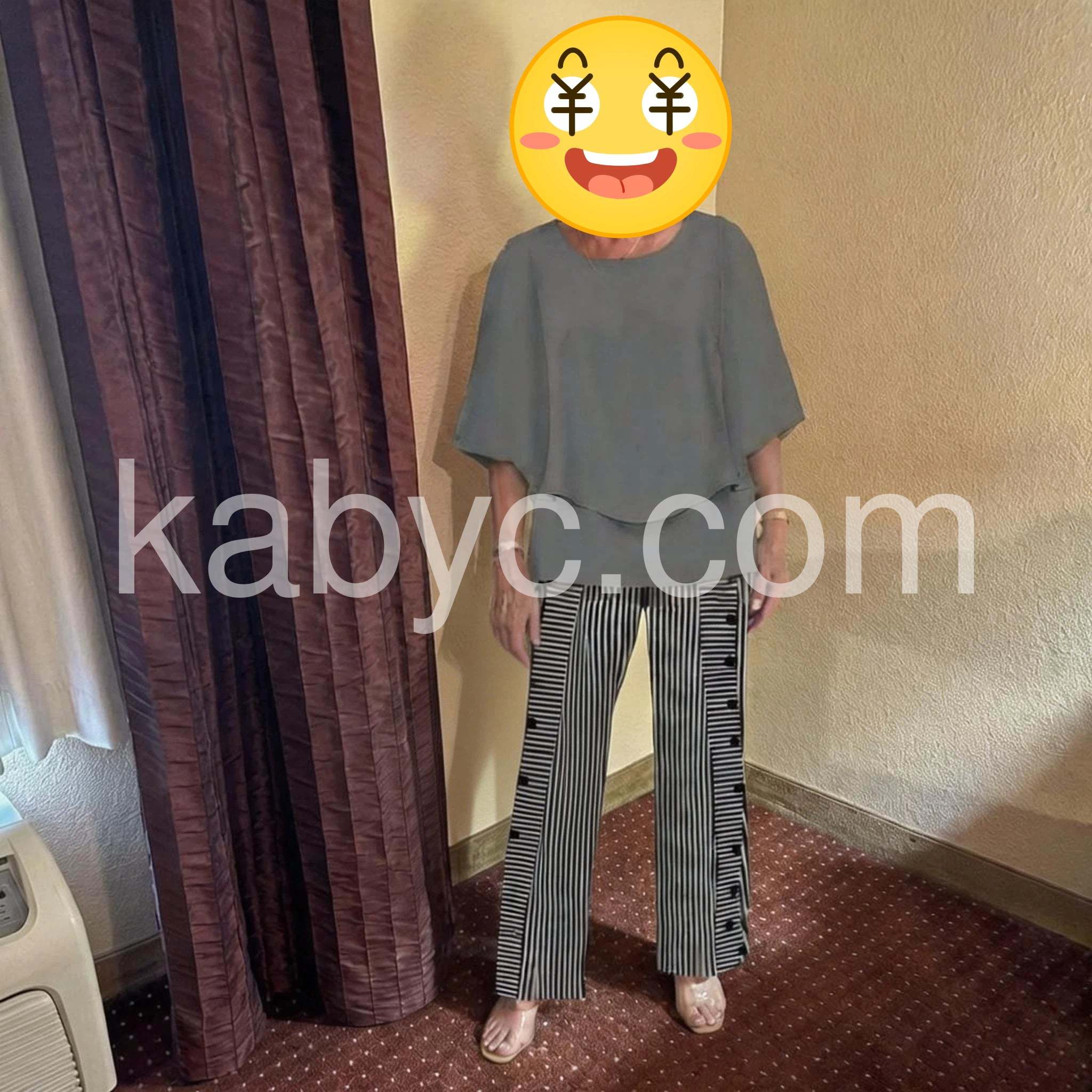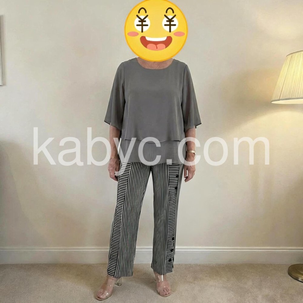This two-piece set radiates effortless sophistication. The draped, layered grey top creates a graceful silhouette, while the tailored striped trousers add a sharp, contemporary edge. It’s the kind of outfit that transitions seamlessly from a casual brunch to a dressier evening out.