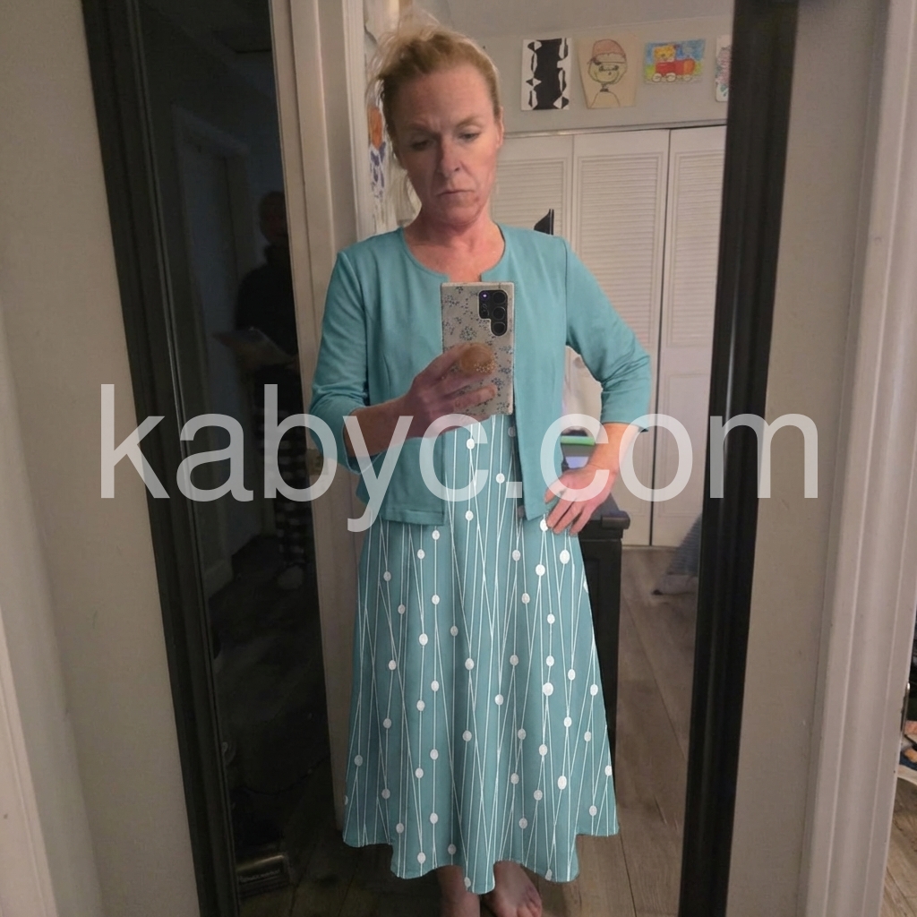 Such a beautiful dress set! The vertical lines really help to elongate the figure, and the little polka dots add a fun, playful touch. The jacket fits perfectly over the dress without looking bulky. I washed it on delicate and hung it to dry, and it came out looking brand new.