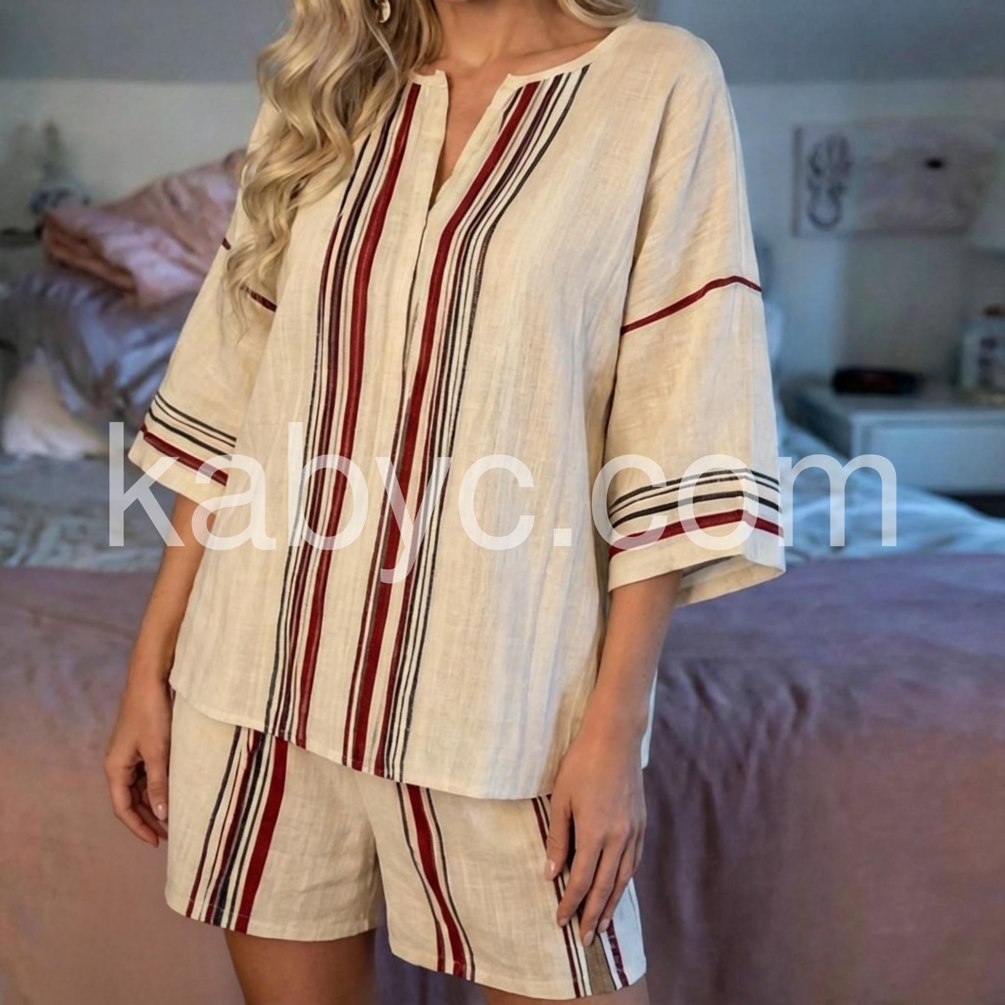 This sophisticated two-piece set features a flattering V-neck design complemented by classic striped patterns. Engineered for optimal comfort without sacrificing style, the coordinated pieces offer versatile styling options for various occasions. The thoughtfully constructed silhouette provides a polished appearance while maintaining ease of movement throughout the day.