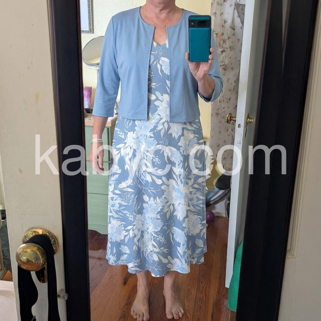 This dress features a flowing midi length with soft blue floral print. Paired with a matching short sleeve jacket for a polished look. V-neckline and side pockets add comfort and style. Lightweight fabric perfect for warm days. Ideal for casual outings or garden events.