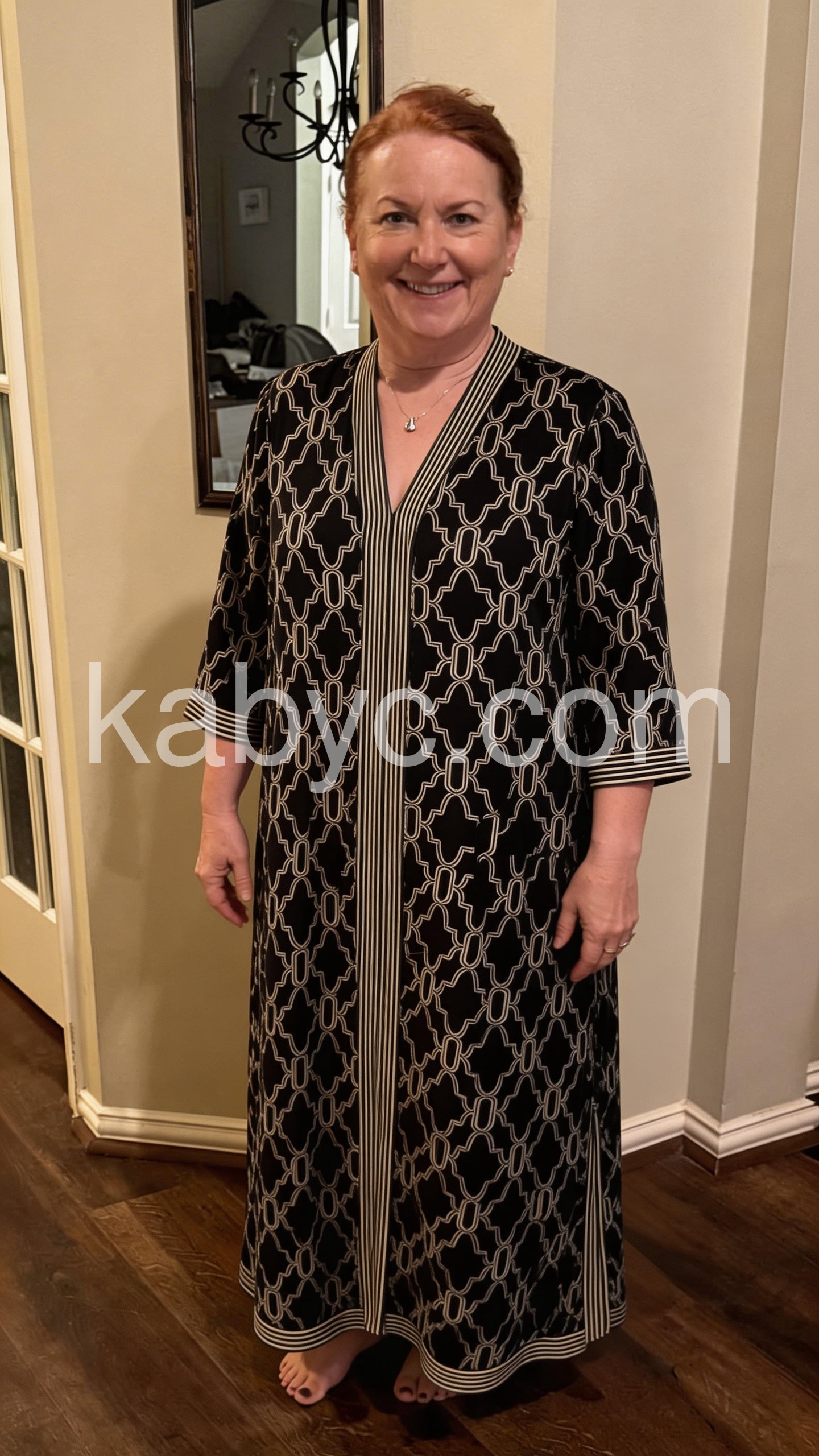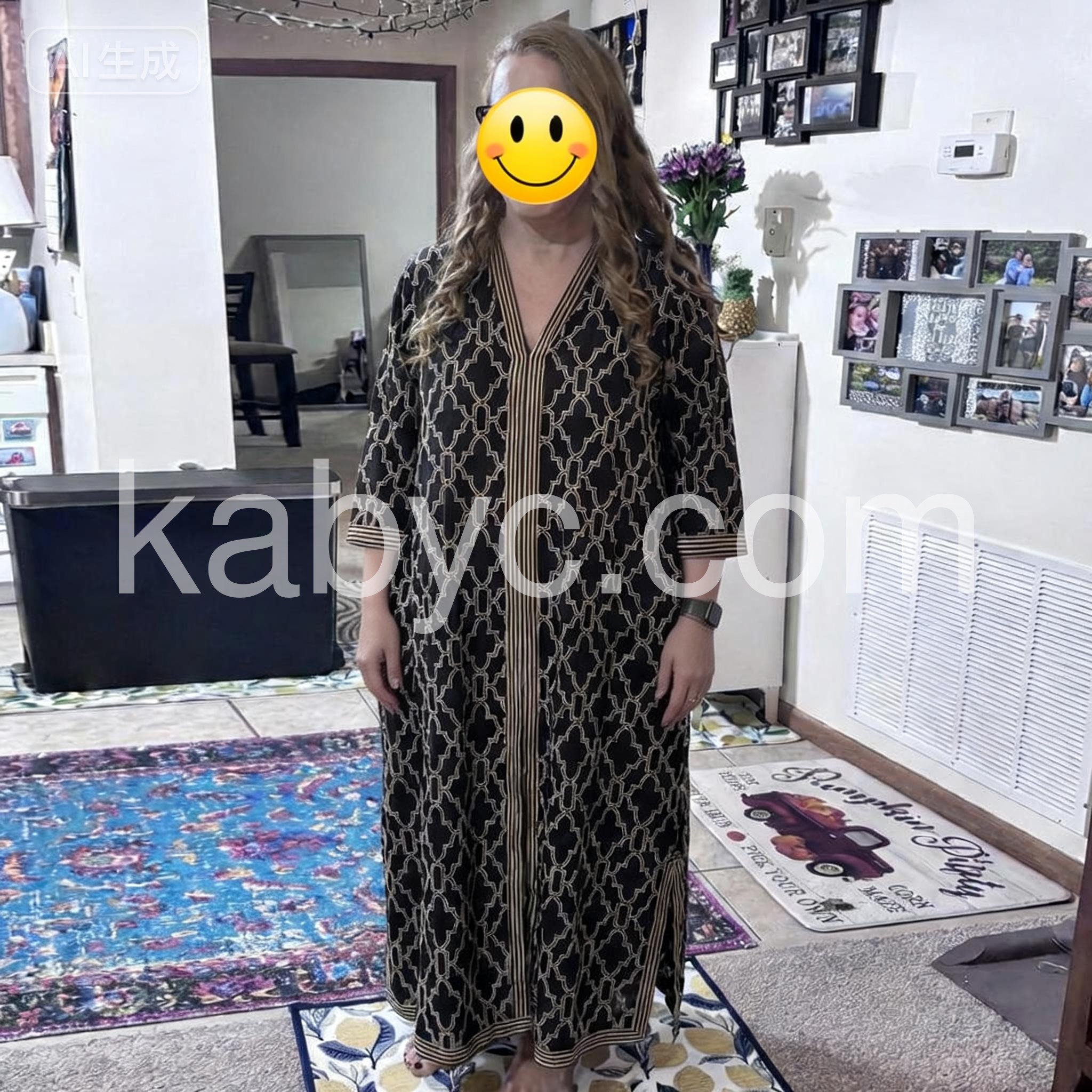Embrace effortless luxury in this Black & White Geometric Print Maxi Dress, a stunning long robe that blends timeless Moroccan-inspired design with modern boho flair. Crafted from lightweight, breathable fabric—likely rayon or cotton blend—this floor-length kaftan features an elegant all-over geometric pattern in crisp white on a rich black base, creating a bold and sophisticated look. The relaxed, open-front silhouette drapes beautifully, offering comfort and style whether you're lounging by the pool or strolling through a tropical garden. Three-quarter sleeves with striped trim add subtle detail, while side pockets provide both function and ease. Styled here with layered necklaces, statement earrings, and bare feet, it’s perfect for beach days, resort wear, or as a chic cover-up. Whether you're unwinding at a seaside villa or enjoying a warm evening breeze, let this elegant maxi robe elevate your look with grace and timeless charm.