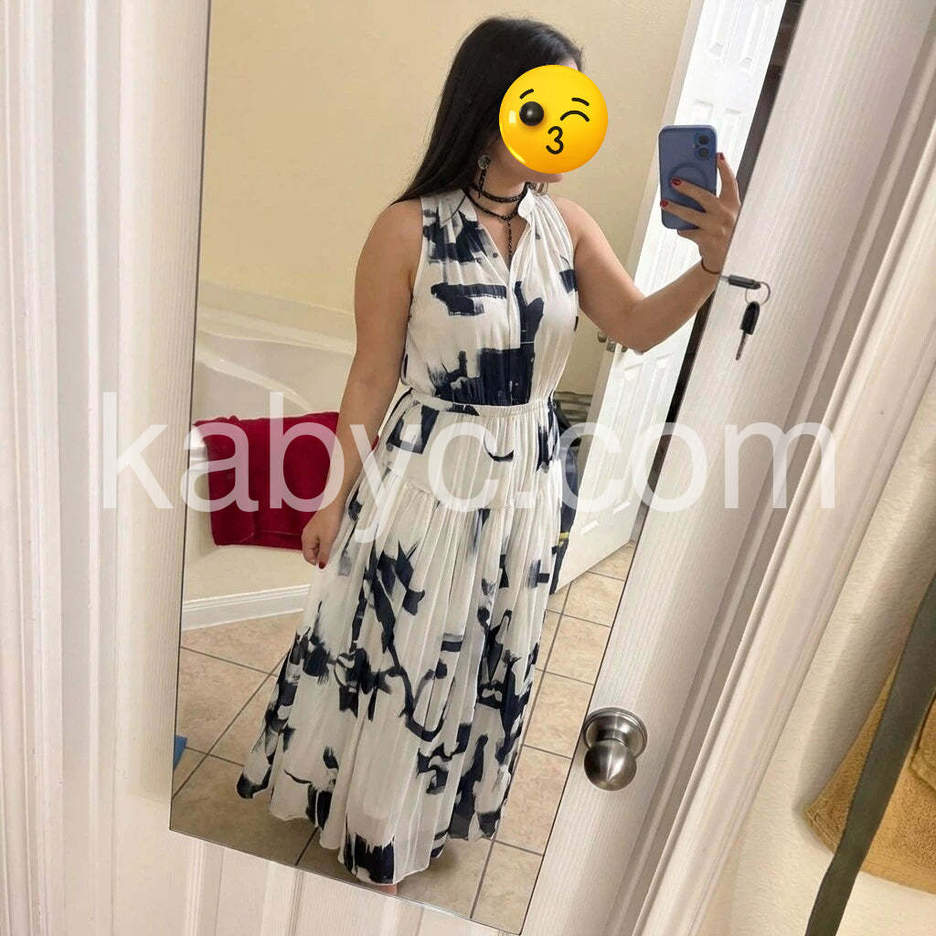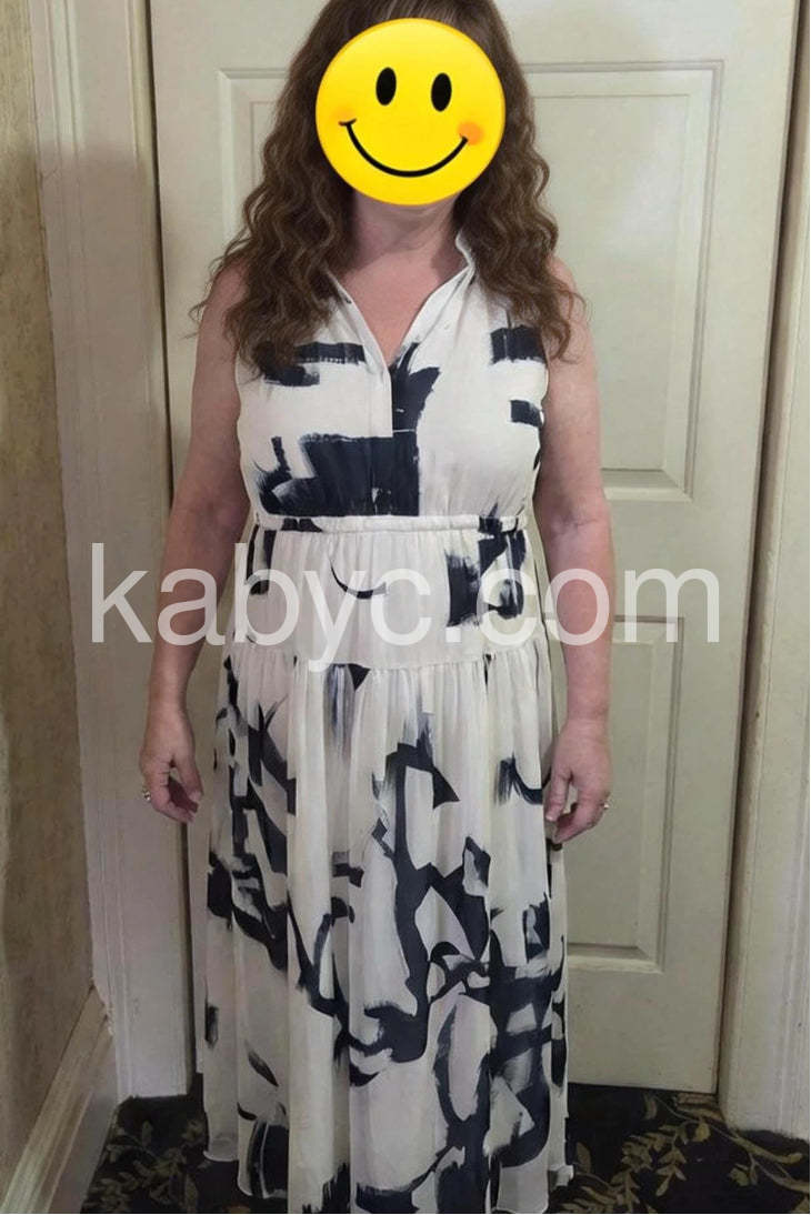 This striking sleeveless maxi dress blends modern artistry with effortless elegance, featuring a bold abstract brushstroke print in deep navy blue on a crisp white background. Crafted from lightweight, fluid fabric—likely chiffon or silk blend—it drapes beautifully, creating a sense of movement and grace. The halter-style neckline with a V-cut adds a touch of sophistication, while the elasticated waist accentuates the silhouette and enhances comfort. The dress features a layered, tiered skirt that flares out dramatically, adding volume and drama with every step. Perfect for beachside events, artistic gatherings, or summer evenings, it combines contemporary design with bohemian flair. Paired with statement jewelry, strappy sandals, and a small clutch, this dress makes a powerful fashion statement. A unique fusion of wearable art and relaxed luxury, it’s ideal for those who appreciate bold patterns and expressive style.
