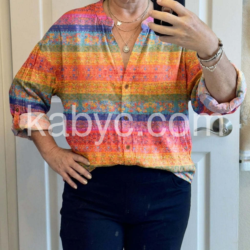 Step into a world of bold color and free-spirited style with this Vibrant Boho Print Multicolor Shirt , a standout piece that celebrates eclectic artistry and laid-back elegance. Crafted from lightweight, breathable fabric—likely cotton or rayon blend—this long-sleeve shirt features a stunning multi-colored tribal print in rich hues of coral, orange, turquoise, purple, and green, arranged in horizontal bands with intricate floral and geometric motifs. The relaxed, oversized silhouette offers ultimate comfort, while the deep V-neckline and full button-down front add a touch of casual sophistication. With rolled-up sleeves and a slightly curved hem, it’s perfect for pairing with distressed jeans, denim shorts, or linen pants. Ideal for beach days, boho festivals, vacation wear, or weekend brunches, this shirt effortlessly brings global inspiration to your wardrobe. Inspired by the vibrant, eclectic styles found on Lulus.com, it’s a must-have for anyone who loves expressive prints and effortless summer fashion. Layer it with statement jewelry, sandals, or a wide-brim hat for a look that radiates confidence and charm. A true celebration of color, culture, and carefree style.