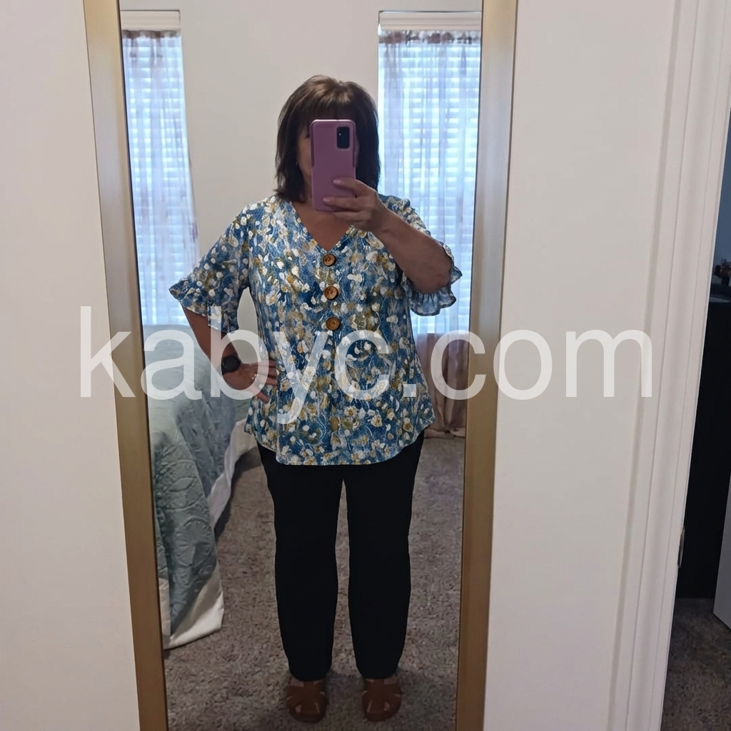 Inspired by oil painting art, this blouse features romantic blue floral prints and ruffle 3/4 sleeves. Soft, flowy fabric ensures a light, comfortable fit.