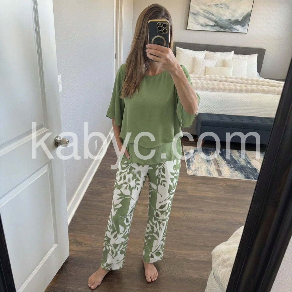 Enhance your style with the Trendy Green Print 3/4 Sleeve Two Piece Set. This fashionable set features a trendy green print and 3/4 sleeves, providing a versatile and chic addition to your wardrobe. Made with high-quality materials, it offers comfort and durability while making a statement. Upgrade your fashion game with this must-have set!